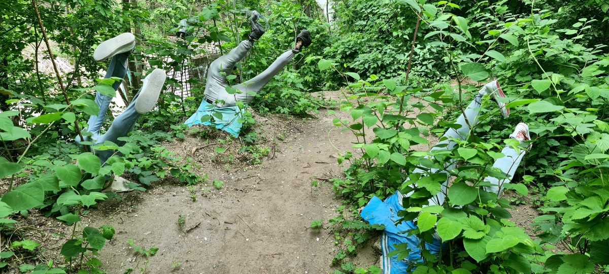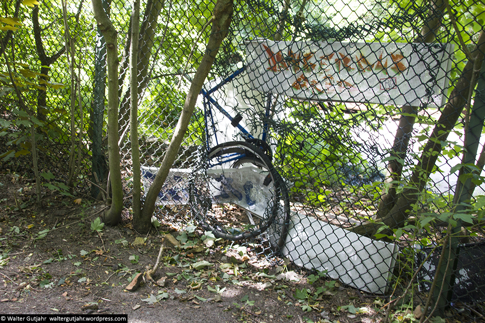 Буквально каждые 5-10 метров в заборе — дыры, сделанные «гостями», которые не хотят платить. В некоторых местах они заделаны весьма оригинальным способом, здесь например — «залатали» старым велосипедом.