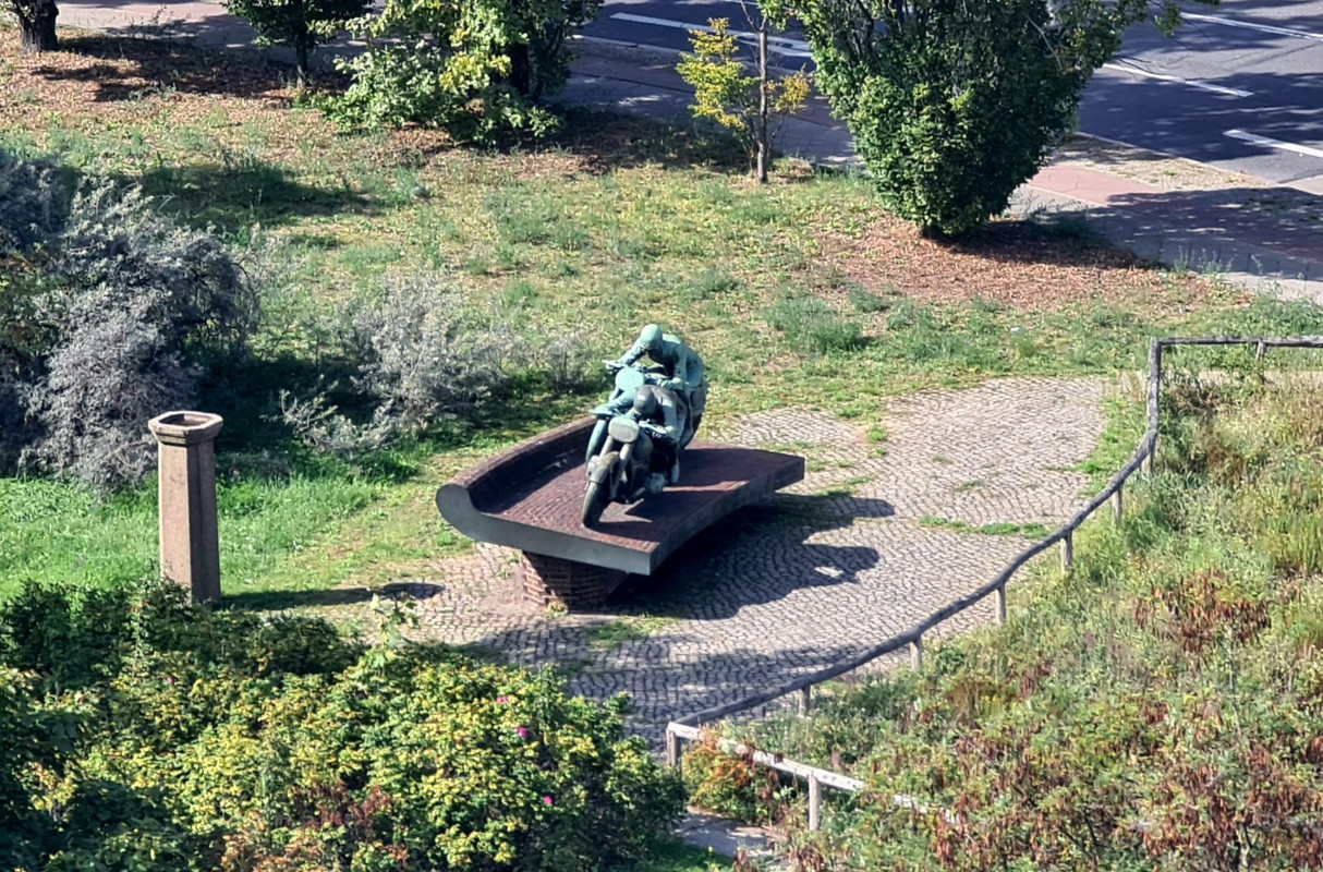 Скульптура изображает Эрнста Хенне на BMW и Эвальда Клюге на DKW.