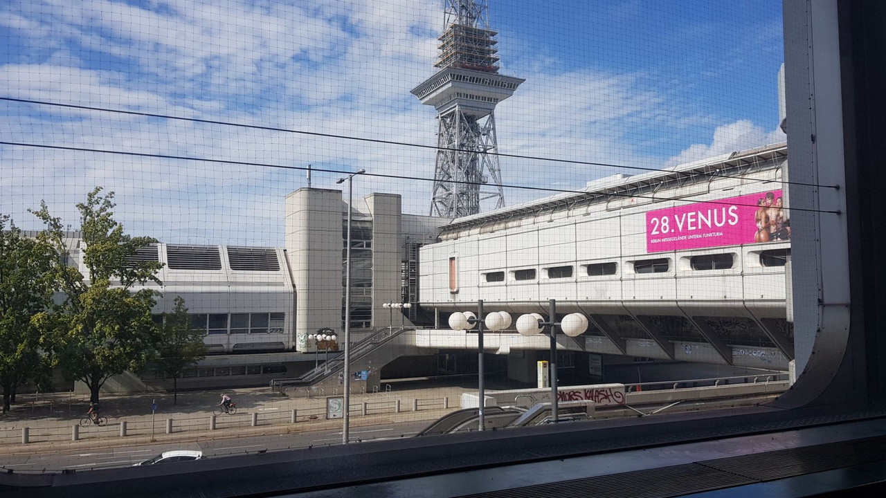 Вид на выстовачный центр (Messe Berlin) и радиобашню (Funkturm) из окна одного из коридоров.