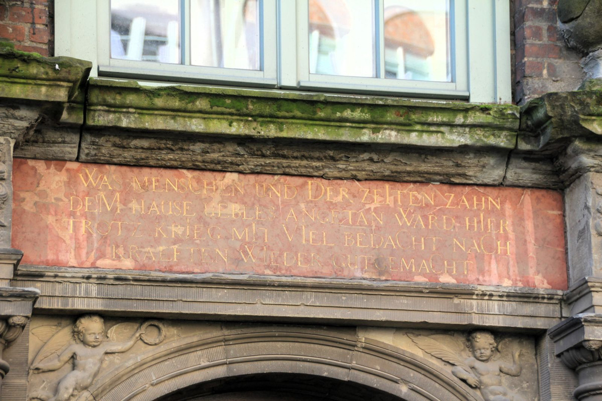 «То, что люди и зуб времени дому злобно причинили, здесь, несмотря на войну, с большим размышлением по силам снова исправлено.»