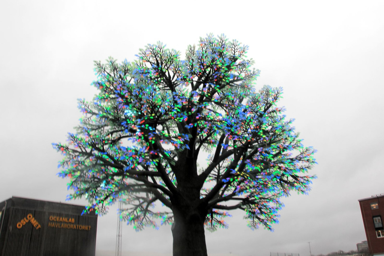 Oslo Treet — огромная световая арт-инсталляция высотой 14 метров с 150 000 программируемых LED-ламп. Она меняет цвета, пульсирует, создаёт волшебные узоры и светит круглый год. Её подарил городу миллиардер Stein Erik Hagen как символ любви Осло к природе и лесам.
